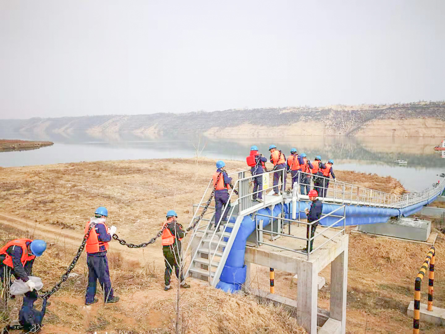 4月6日上午8時(shí),項(xiàng)目部協(xié)調(diào)汽機(jī)班、綜合班抽調(diào)12名檢修人員,負(fù)責(zé)搬運(yùn)和加長(zhǎng)錨鏈工作。工作現(xiàn)場(chǎng),安全專工對(duì)全體工作人員做好安全交底,一再?gòu)?qiáng)調(diào)風(fēng)險(xiǎn)點(diǎn)并檢查預(yù)控措施萬(wàn)無(wú)一失。大家肩扛手搬,接龍作戰(zhàn),小心翼翼地走上廊橋。每個(gè)人肩上的負(fù)重都超過(guò)了50公斤,頭頂是塞北的藍(lán)天白云,腳下是狹窄的廊橋船舷,身上橘色的救生衣與藍(lán)天碧水,形成一道靚麗的風(fēng)景線。當(dāng)日中午12時(shí),錨鏈搬運(yùn)安裝工作順利完成,有力保障了取水泵船和輸水管線的安全運(yùn)行,得到了業(yè)主方的表?yè)P(yáng)和嘉獎(jiǎng)。