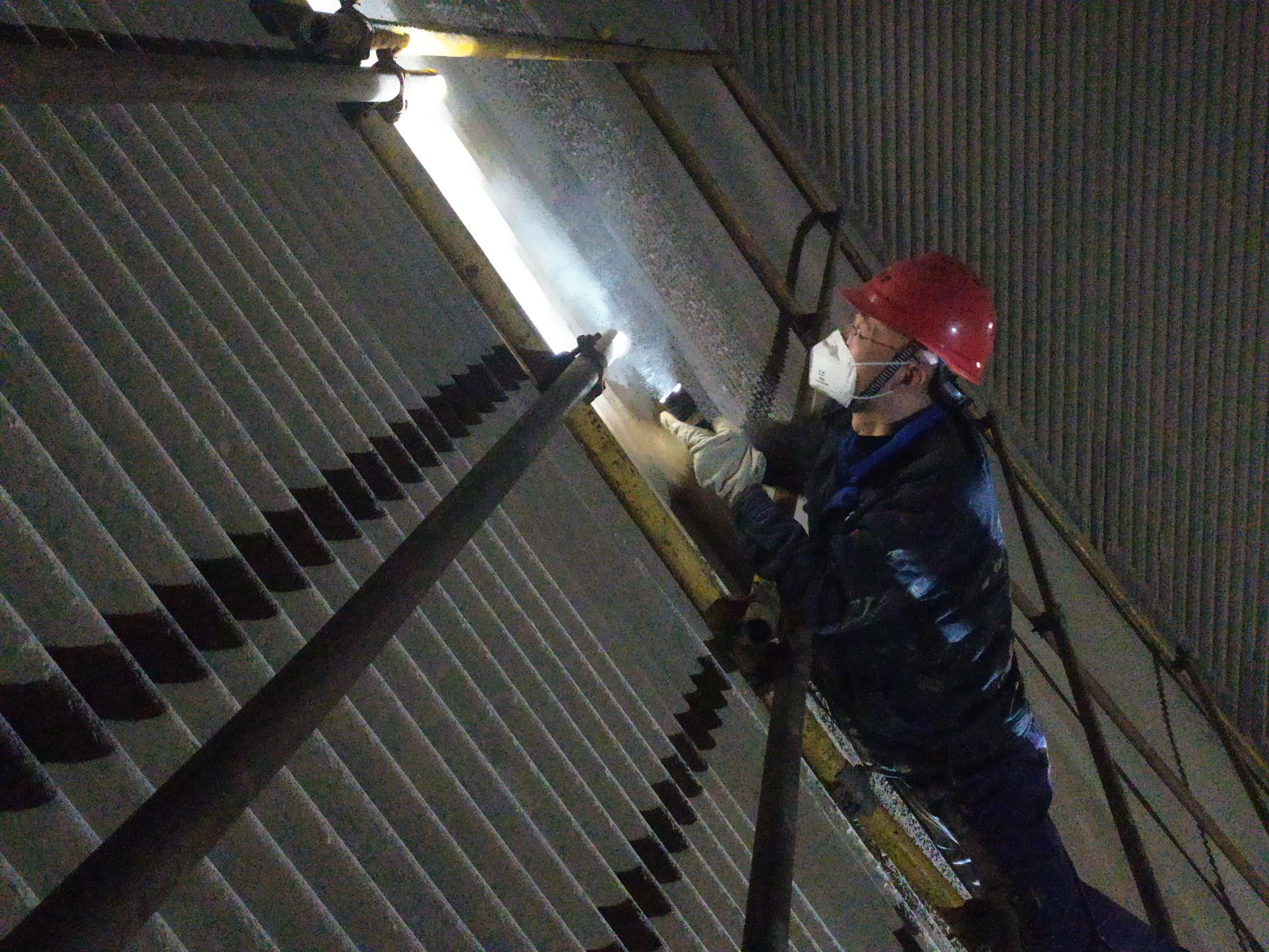 12米水冷壁渣斗內(nèi),工作人員正沿著密密麻麻的管排一根接著一根緊張地進(jìn)行查漏工作。劉宏在外面系好安全帶后,“呲溜”一聲從40厘米見方的人孔進(jìn)了爐膛。我看了看人孔大小,又瞅瞅自己的腰圍,只好作罷。進(jìn)了渣斗,劉宏向工作人員詢問了兩句工作情況,就踩著梯子,拂去附著在管道上的煤粉,一段一段用手摸著,尋找“病灶”。一排管束摸完下來,劉宏又“呲溜”一聲鉆了出來。