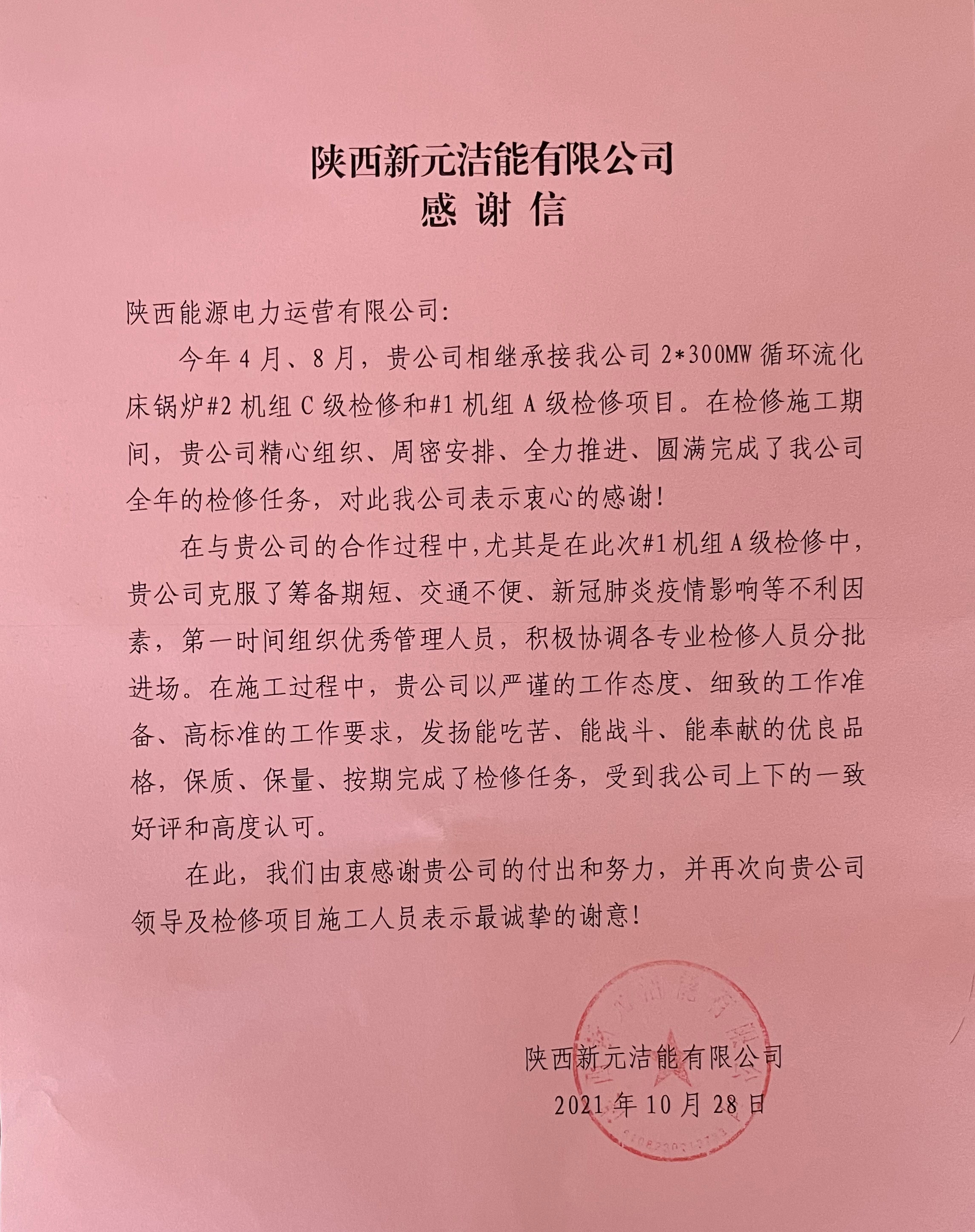 近日,公司收到陜煤集團(tuán)陜西新元潔能有限公司的感謝信,對在圓滿完成#2機(jī)組C級檢修和#1機(jī)組A級檢修項(xiàng)目中展現(xiàn)出的專業(yè)水準(zhǔn)和頑強(qiáng)作風(fēng)表示充分肯定,標(biāo)志著公司拓展集團(tuán)外等級檢修業(yè)務(wù)取得長足進(jìn)展。