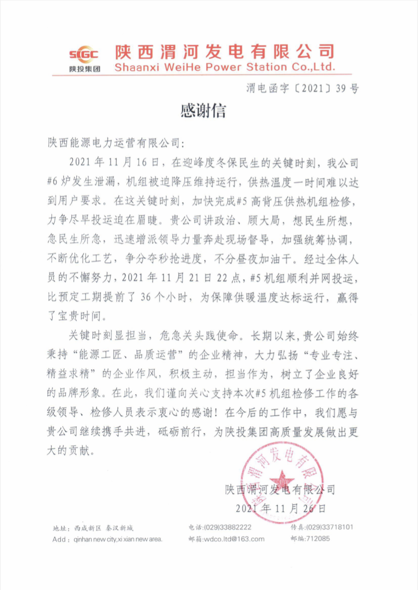 日前,公司分別收到渭河發(fā)電、吉木薩爾發(fā)電的感謝信、表揚(yáng)信。