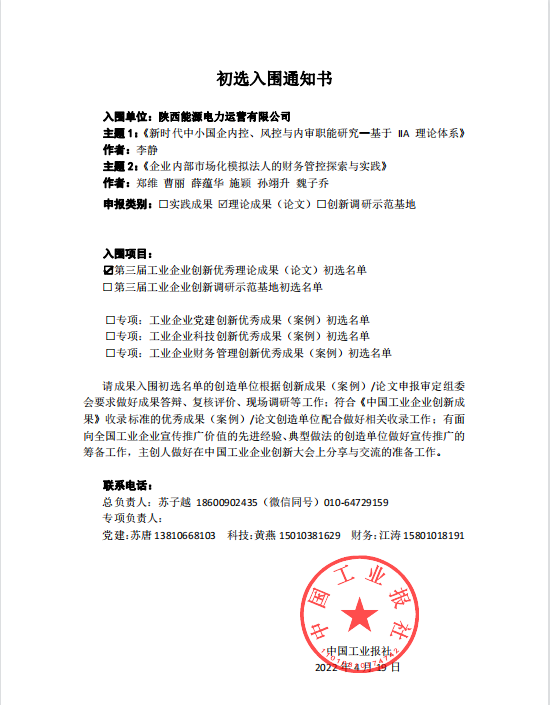 近期,公司《企業(yè)內(nèi)部市場化模擬法人的財務(wù)管控探索與實踐》與《新時代中小國企內(nèi)控、內(nèi)控與內(nèi)審職能研究—基于IIA理論體系》兩篇論文,成功入圍中國工業(yè)報社第三屆工業(yè)企業(yè)創(chuàng)新優(yōu)秀理論成果(論文)初選名單。