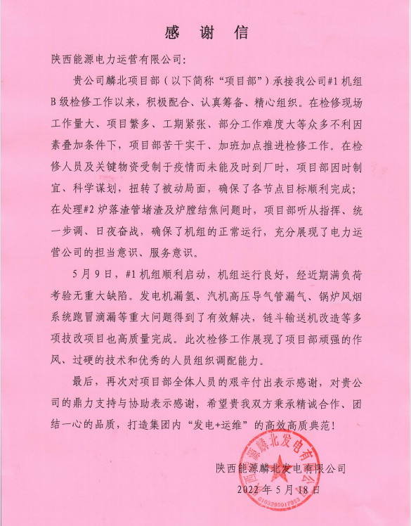 近日,公司收到來自麟北發(fā)電公司的感謝信,對麟北項目部在麟北發(fā)電公司#1機組B級檢修工作中展現(xiàn)出的頑強作風,過硬技術和組織調配能力表示感謝。