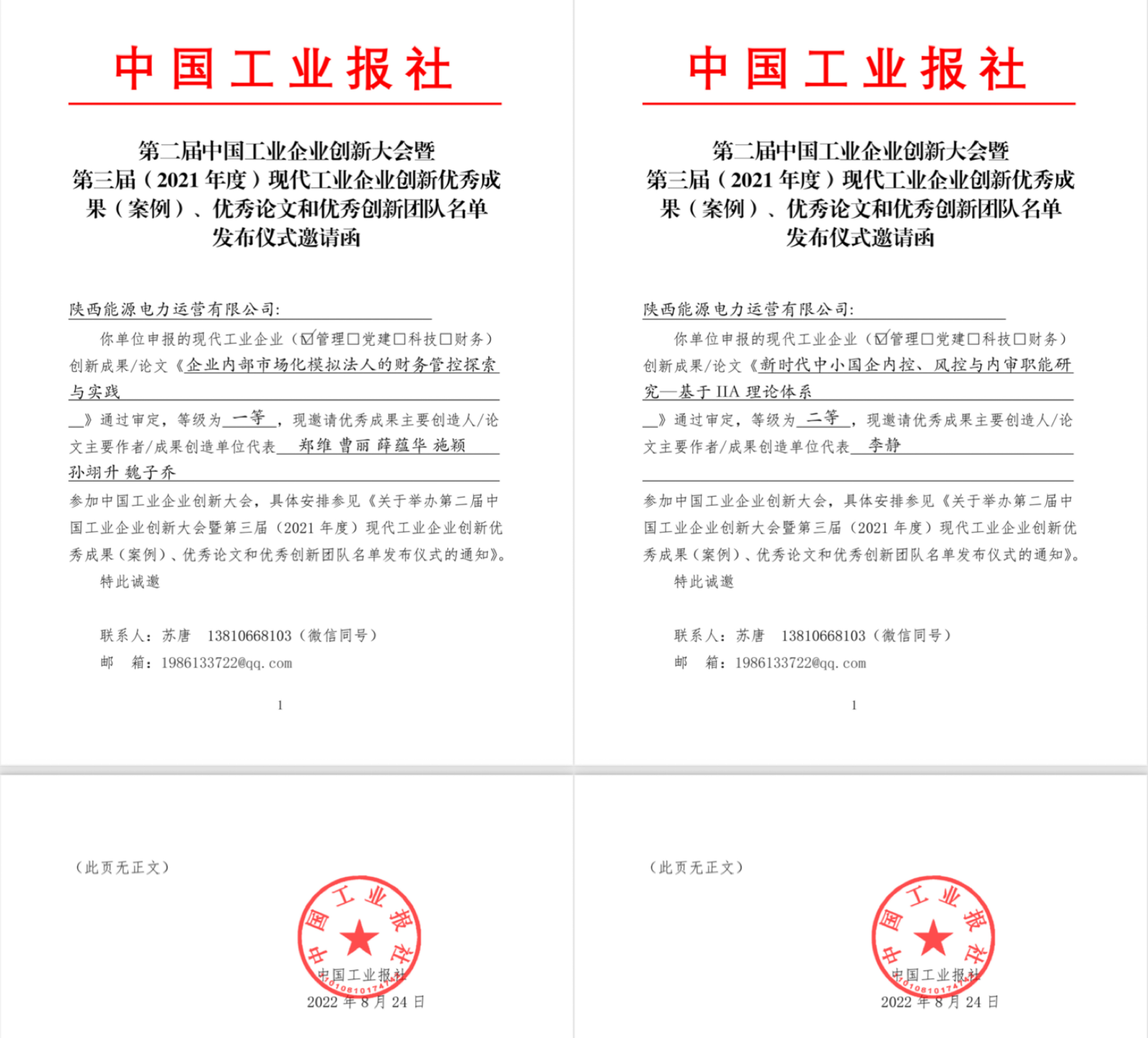 日前,公司《企業(yè)內(nèi)部市場化模擬法人的財務(wù)管控探索與實踐》《新時代中小國企內(nèi)控、內(nèi)控與內(nèi)審職能研究——基于IIA理論體系》兩篇學(xué)術(shù)論文分獲第二屆中國工業(yè)企業(yè)創(chuàng)新大會暨第三屆現(xiàn)代工業(yè)企業(yè)創(chuàng)新優(yōu)秀成果(案例)、優(yōu)秀論文和優(yōu)秀創(chuàng)新團(tuán)隊評比一等獎、二等獎。
