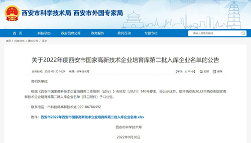 近日,西安市科學技術局發(fā)布了2022年度西安市國家高新技術企業(yè)培育庫第二批入庫企業(yè)名單,君創(chuàng)科技成功入選,入庫編號GQPY2022004751。