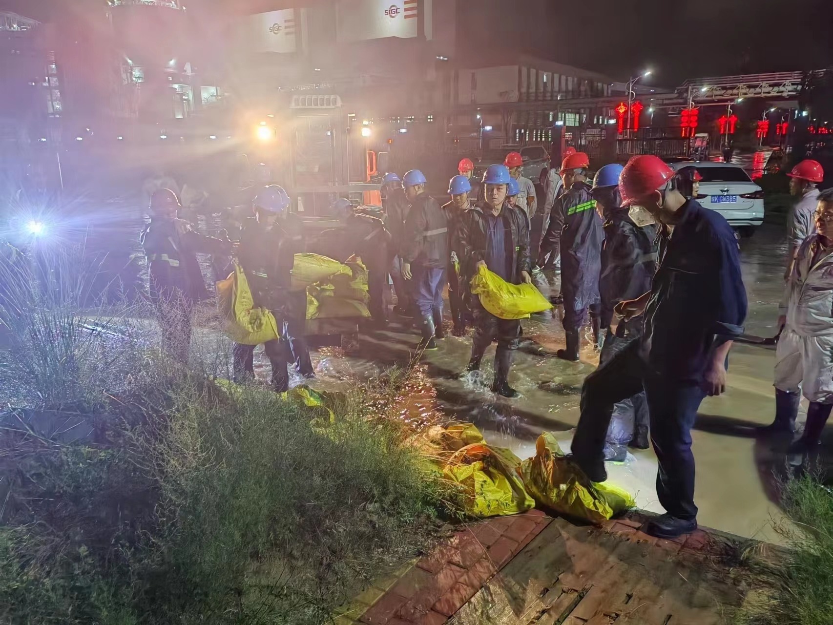 下午18時(shí)許,狂風(fēng)大作,天空下起小雨。值班和管理人員立即開始巡查。21:30,大雨滂沱,防汛應(yīng)急人員全員進(jìn)入現(xiàn)場(chǎng)搶險(xiǎn)。此時(shí),檢修樓前路面積水成河,雨水已沒過了腳面。由于雨量過大,全廠的雨水都匯聚到了西門外,排水渠的積水也越來越深,甚至有倒灌回廠區(qū)的情況發(fā)生。搶險(xiǎn)人員立即清理排水渠內(nèi)雜物,確保排水通暢。搬運(yùn)沙袋圍檔堵住西門通道,形成防洪堤壩,防止雨水倒灌。在項(xiàng)目部有序組織協(xié)調(diào)下,汛情快速得到控制。