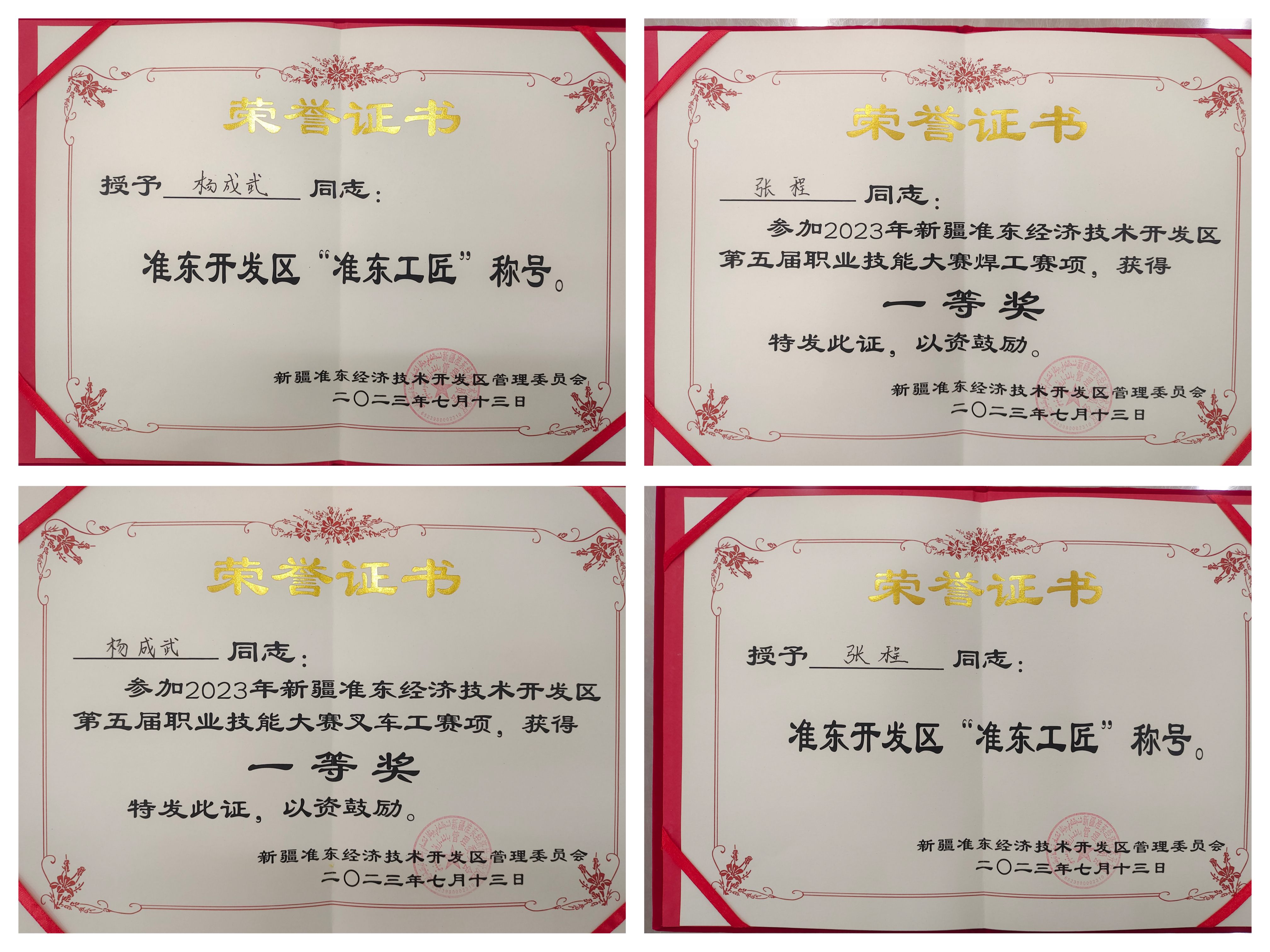 繼6月2日吉木薩爾項目部青工張程榮獲昌吉州2023年度“青年安全生產(chǎn)示范崗”榮譽稱號后,項目部又傳喜訊,7月13日,在新疆準東國家經(jīng)濟技術(shù)開發(fā)區(qū)第五屆職業(yè)技能大賽中,楊成武、張程分別奪得叉車、焊工組比賽第一名,并獲準東開發(fā)區(qū)“準東工匠”榮譽稱號。