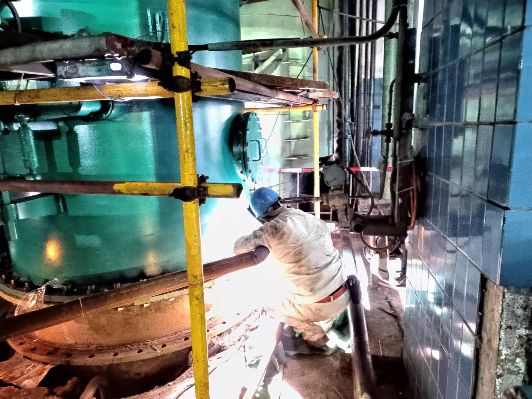 時值三伏,搶修現(xiàn)場十分火“熱”。本次更換僅直徑1.8米的法蘭焊口就有6道,焊接工作量巨大。焊工們穿戴著厚厚的焊工服和手套,全副武裝地在腳手架上一焊就是幾個小時。此起彼伏的電焊聲“呲呲”作響,高溫加上焊花的雙重“烤”驗,豆大的汗水順著頭發(fā)、眉毛、臉頰往下流淌,身上的衣服也浸出一圈又一圈的白色汗?jié)n,他們成了名副其實的“帶鹽人”。
