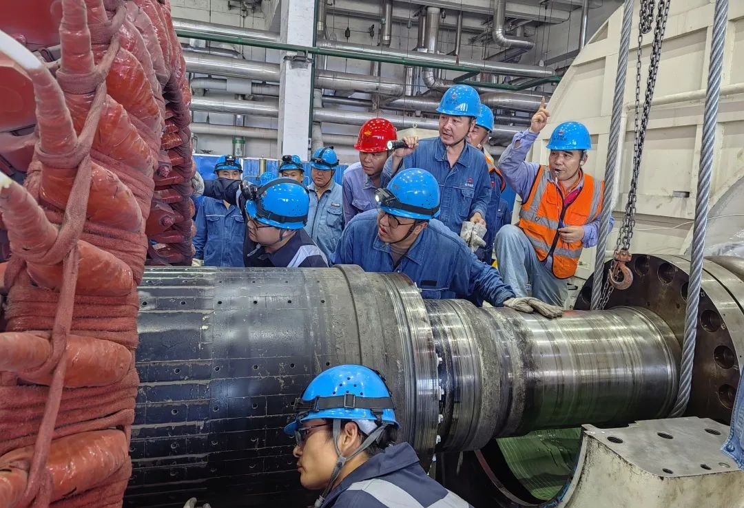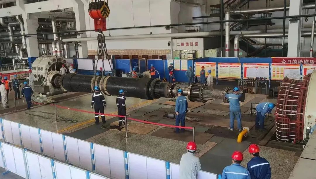14:00,在起重人員的統(tǒng)一指揮下,發(fā)電機(jī)轉(zhuǎn)子軸頭嶄露?!奥稽c(diǎn),保證轉(zhuǎn)子水平,注意監(jiān)視抬軸量”,電氣人員正目不轉(zhuǎn)睛觀測(cè)轉(zhuǎn)子與定子的間隙,起重人員熟練的調(diào)整轉(zhuǎn)子水平度,確保轉(zhuǎn)子全過(guò)程始終處于平穩(wěn)狀態(tài)。經(jīng)過(guò)6個(gè)多小時(shí)的不懈努力,這個(gè)長(zhǎng)14米,重達(dá)64噸的“大家伙”終于全部亮相,標(biāo)志著#4機(jī)C修工作一個(gè)重大工作節(jié)點(diǎn)順利完成,為安全、優(yōu)質(zhì)、高效完成等級(jí)檢修奠定堅(jiān)實(shí)的基礎(chǔ)。