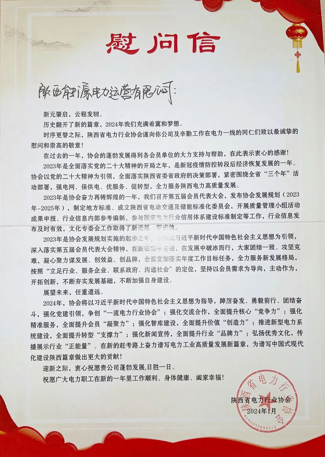 近日,公司收到陜西省電力行業(yè)協(xié)會發(fā)來的慰問信,對公司及辛勤工作在電力生產(chǎn)一線的同仁們致以誠摯慰問,對公司在2023年度大力支持協(xié)會各項業(yè)務(wù)工作,積極參與協(xié)會重要活動,有效助推協(xié)會行穩(wěn)致遠、高質(zhì)量發(fā)展表示衷心感謝。