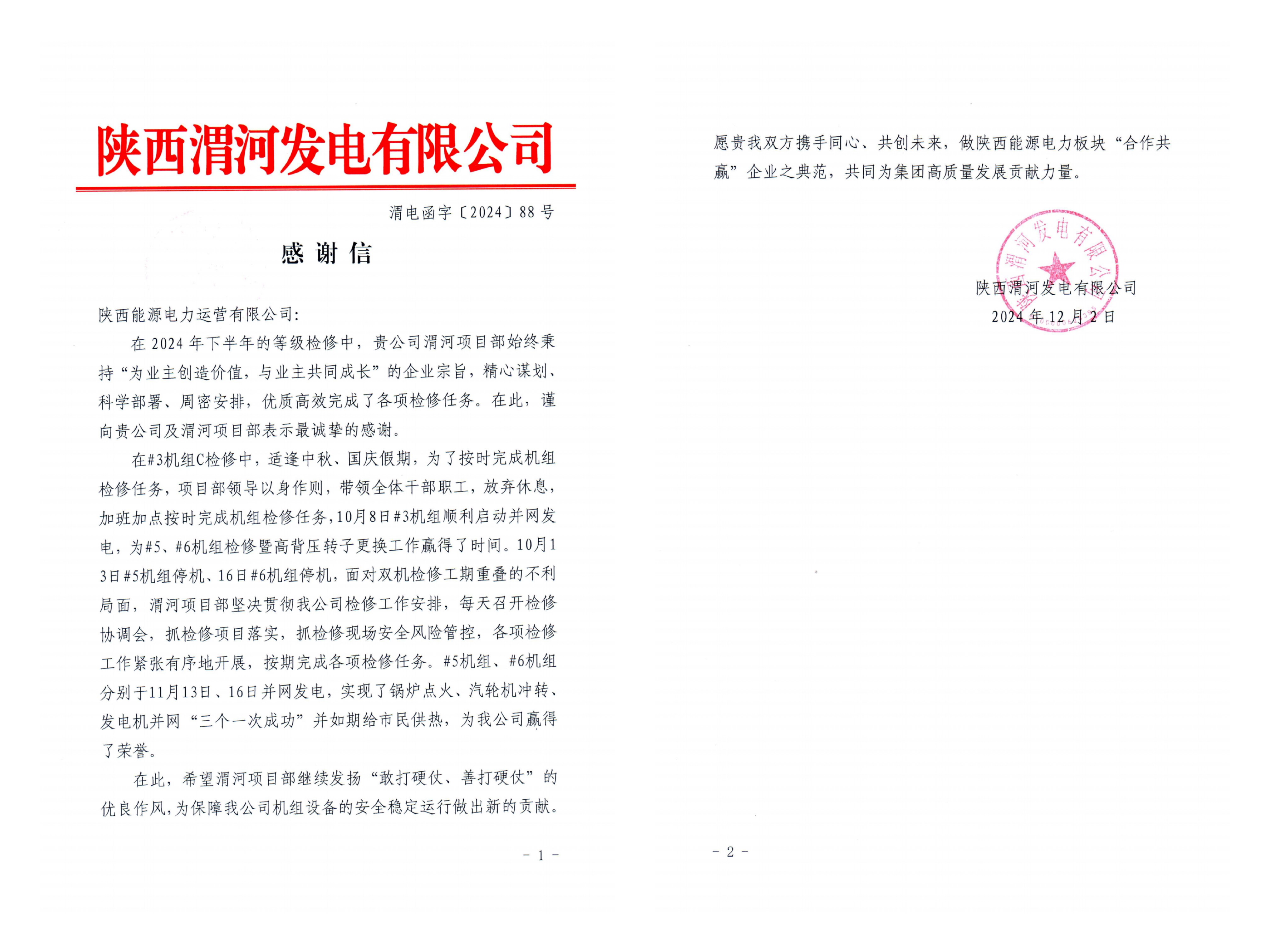 日前,公司收到渭河發(fā)電感謝信,對(duì)渭河項(xiàng)目部優(yōu)質(zhì)高效完成2024年下半年等級(jí)檢修任務(wù)表示感謝。