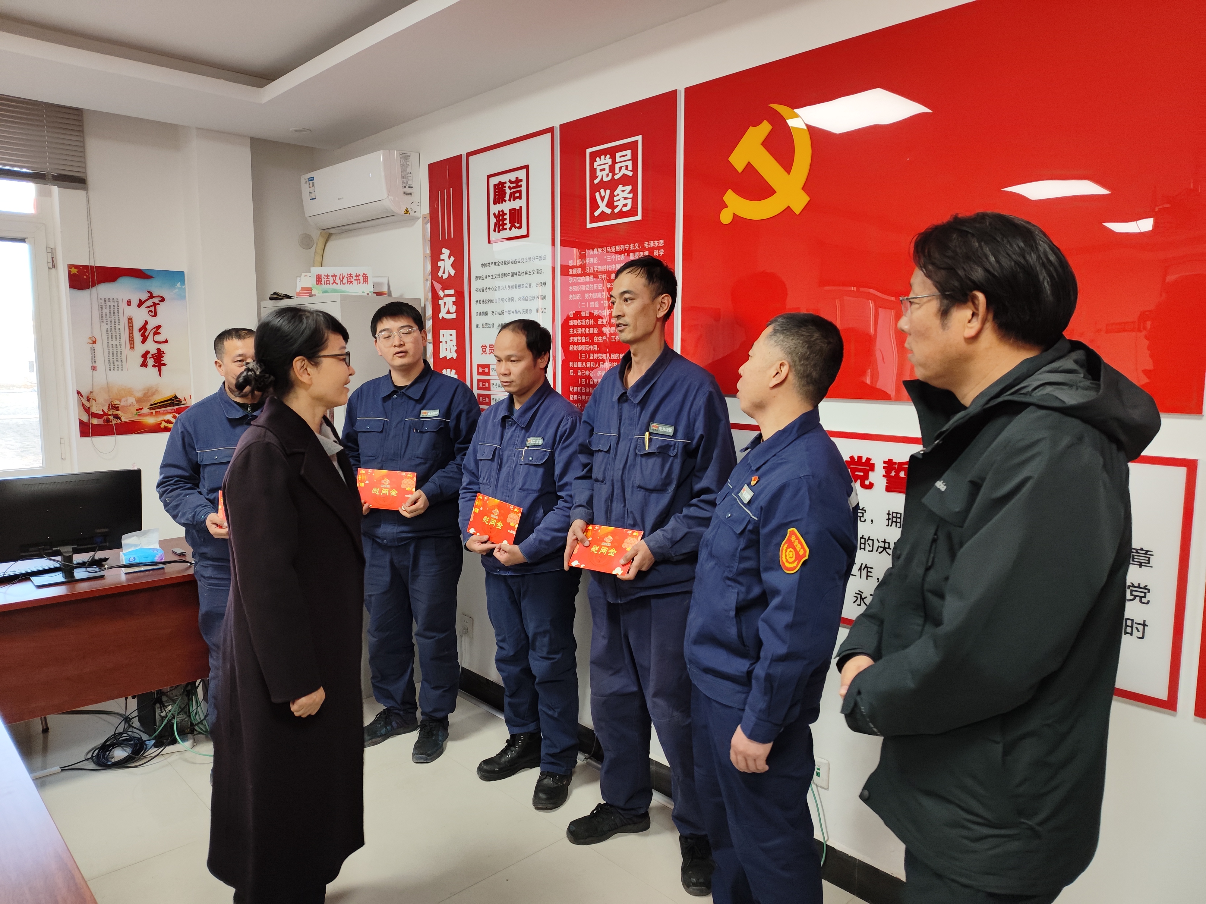 在趙石畔項(xiàng)目部,劉麗慰問(wèn)了鍋爐班一線員工并仔細(xì)詢問(wèn)了大家個(gè)人收入情況,肯定了項(xiàng)目部在班組標(biāo)準(zhǔn)化建設(shè)、安全生產(chǎn)、設(shè)備維保、科技創(chuàng)新、職工技能大賽等方面取得的亮眼成績(jī)。在清水川項(xiàng)目部,劉麗書記對(duì)項(xiàng)目部一年來(lái)取得的成績(jī)表示肯定,希望全體職工再接再厲,為清水川能源6臺(tái)機(jī)組安全穩(wěn)定運(yùn)行保駕護(hù)航。慰問(wèn)困難職工時(shí),劉麗鼓勵(lì)大家樹立信心、保持樂(lè)觀心態(tài),并為他們送上慰問(wèn)金。