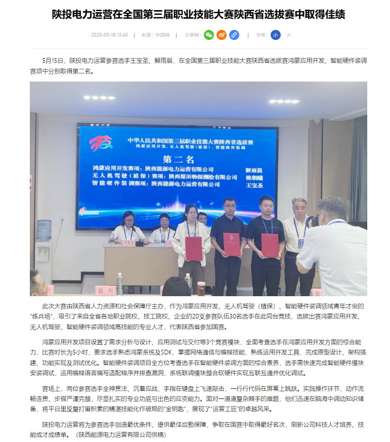 5月15日,陜投電力運營參賽選手王寶圣、解雨晨,在全國第三屆職業(yè)技能大賽陜西省選拔賽鴻蒙應(yīng)用開發(fā)、智能硬件裝調(diào)賽項中分別取得第二名。