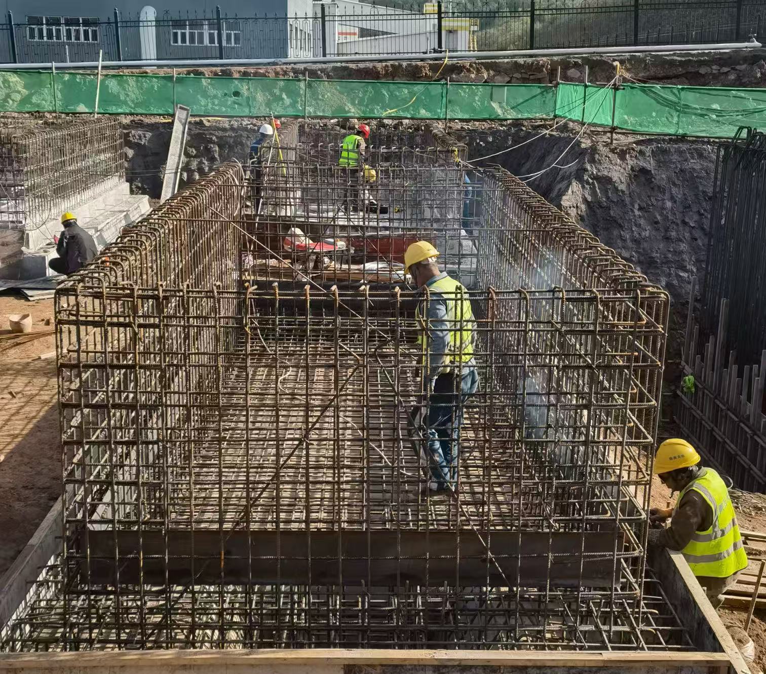 在有效應(yīng)對(duì)天氣影響的同時(shí),項(xiàng)目團(tuán)隊(duì)配備挖掘機(jī)、吊車(chē)等10余臺(tái)設(shè)備,全面鋪開(kāi)作業(yè)面,#1、#2飛輪艙基礎(chǔ)實(shí)現(xiàn)從放線驗(yàn)收到鋼筋加工、綁扎全流程閉環(huán),飛輪及電池PCS一體機(jī)基礎(chǔ)完成鋼筋綁扎、止水板焊接、模板支護(hù)及基礎(chǔ)澆筑,#3、#4飛輪艙基礎(chǔ)完成墻模板支護(hù)、螺栓預(yù)埋、舉牌驗(yàn)收及基礎(chǔ)澆筑有序推進(jìn)。