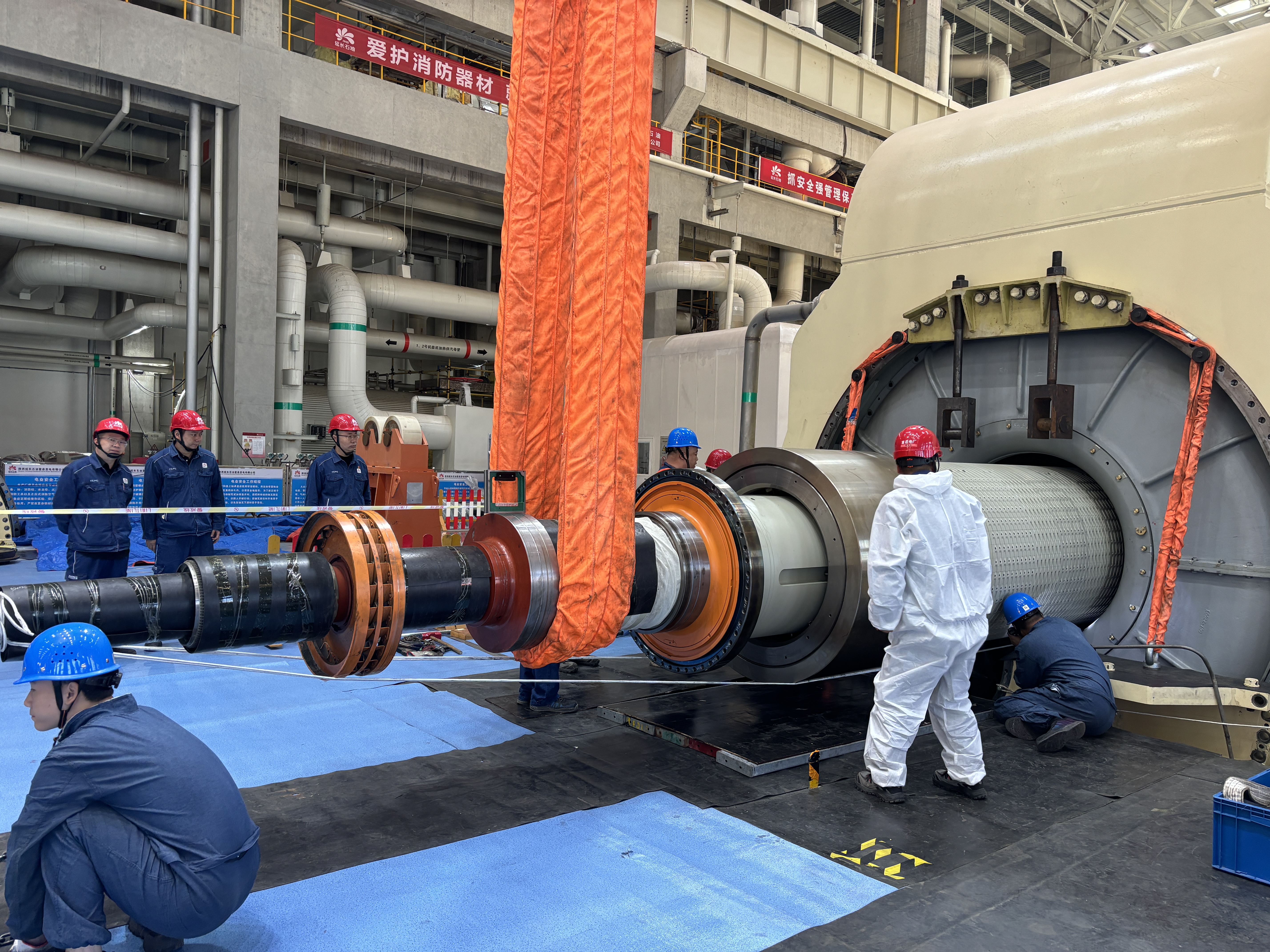 近日,公司承攬的集團外重點項目延長富縣電廠#2百萬機組檢修迎來關鍵節(jié)點,重達104噸、長達15.7米的發(fā)電機轉(zhuǎn)子一次平穩(wěn)抽離定子內(nèi)膛,精準落位于專用支架,標志著此次B級檢修取得重要階段性成果。