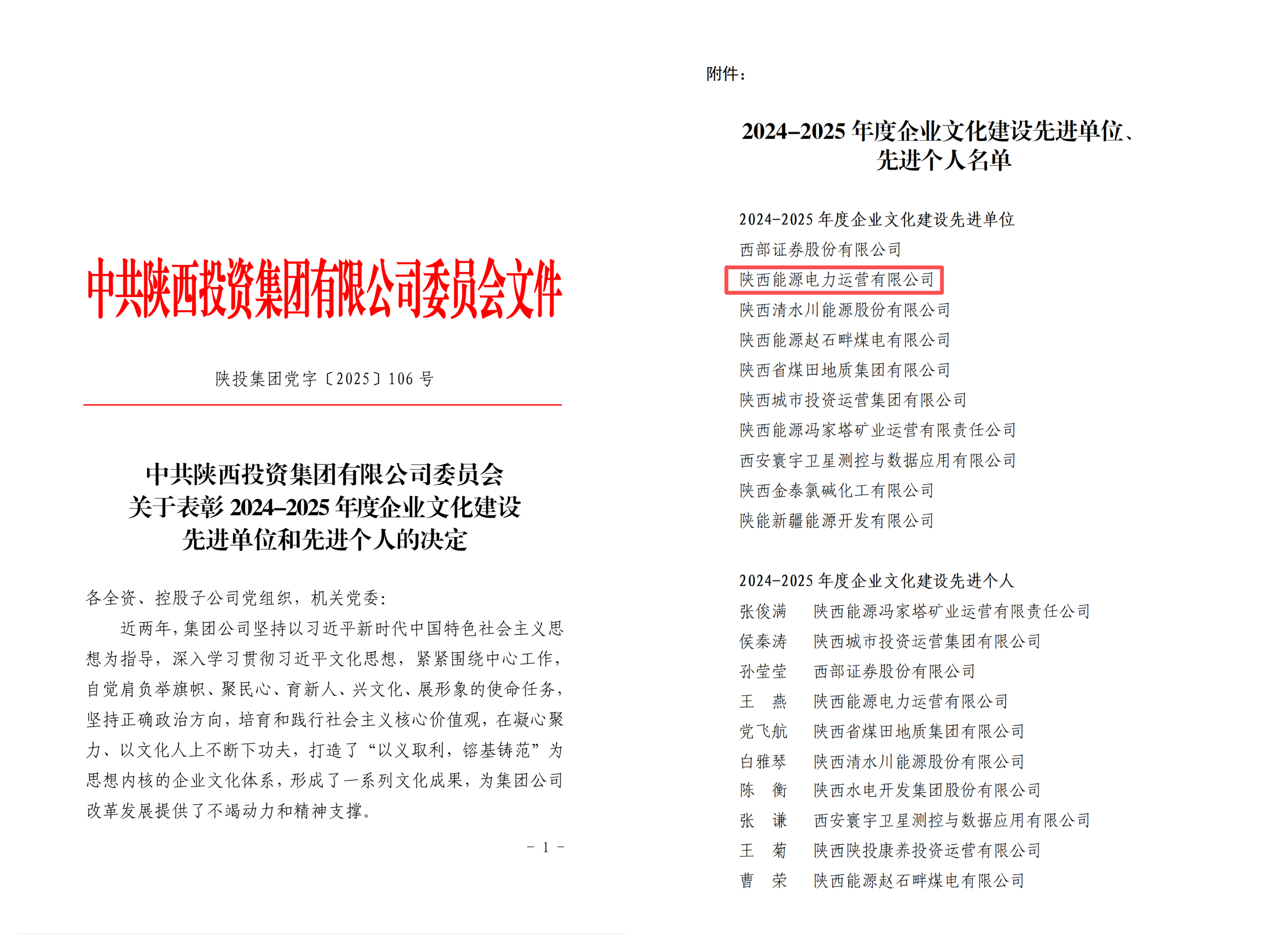 日前,在陜投集團(tuán)2024-2025年度企業(yè)文化建設(shè)先進(jìn)評選中,公司被授予“企業(yè)文化建設(shè)先進(jìn)單位”榮譽(yù)稱號,黨委工作部王燕榮獲“企業(yè)文化建設(shè)先進(jìn)個人”,富縣項(xiàng)目部綜合班班長馬鵬飛獲評“一線崗位標(biāo)兵”。