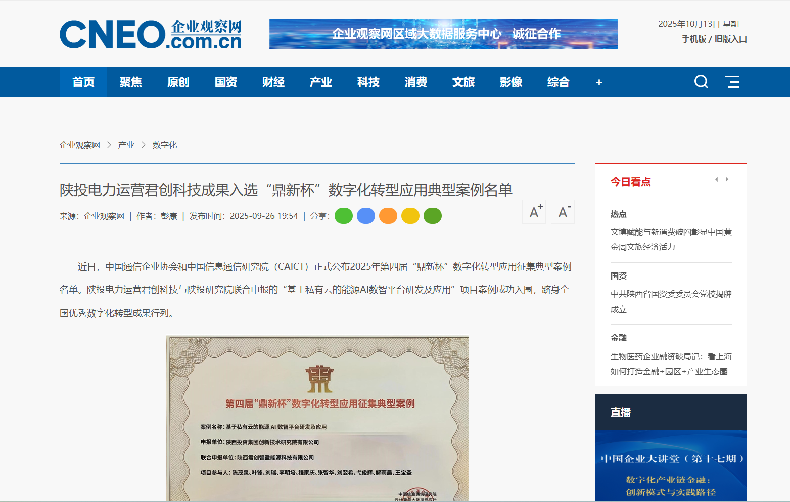 近日,中國通信企業(yè)協(xié)會和中國信息通信研究院(CAICT)正式公布2025年第四屆“鼎新杯”數(shù)字化轉(zhuǎn)型應(yīng)用征集典型案例名單。陜投電力運營君創(chuàng)科技與陜投研究院聯(lián)合申報的“基于私有云的能源AI數(shù)智平臺研發(fā)及應(yīng)用”項目案例成功入圍,躋身全國優(yōu)秀數(shù)字化轉(zhuǎn)型成果行列。