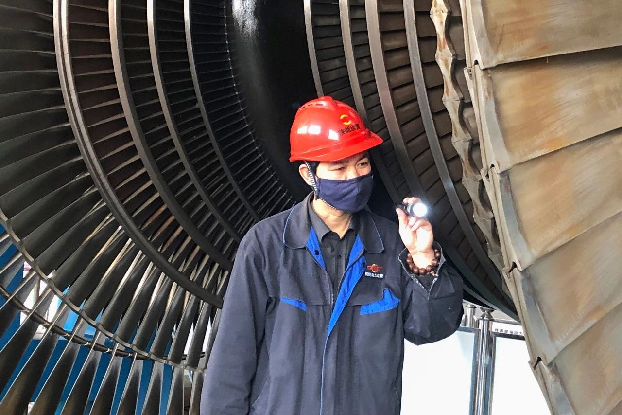 3月13日,渭河項目部機務隊主機班詹涇永在檢查汽輪機葉片