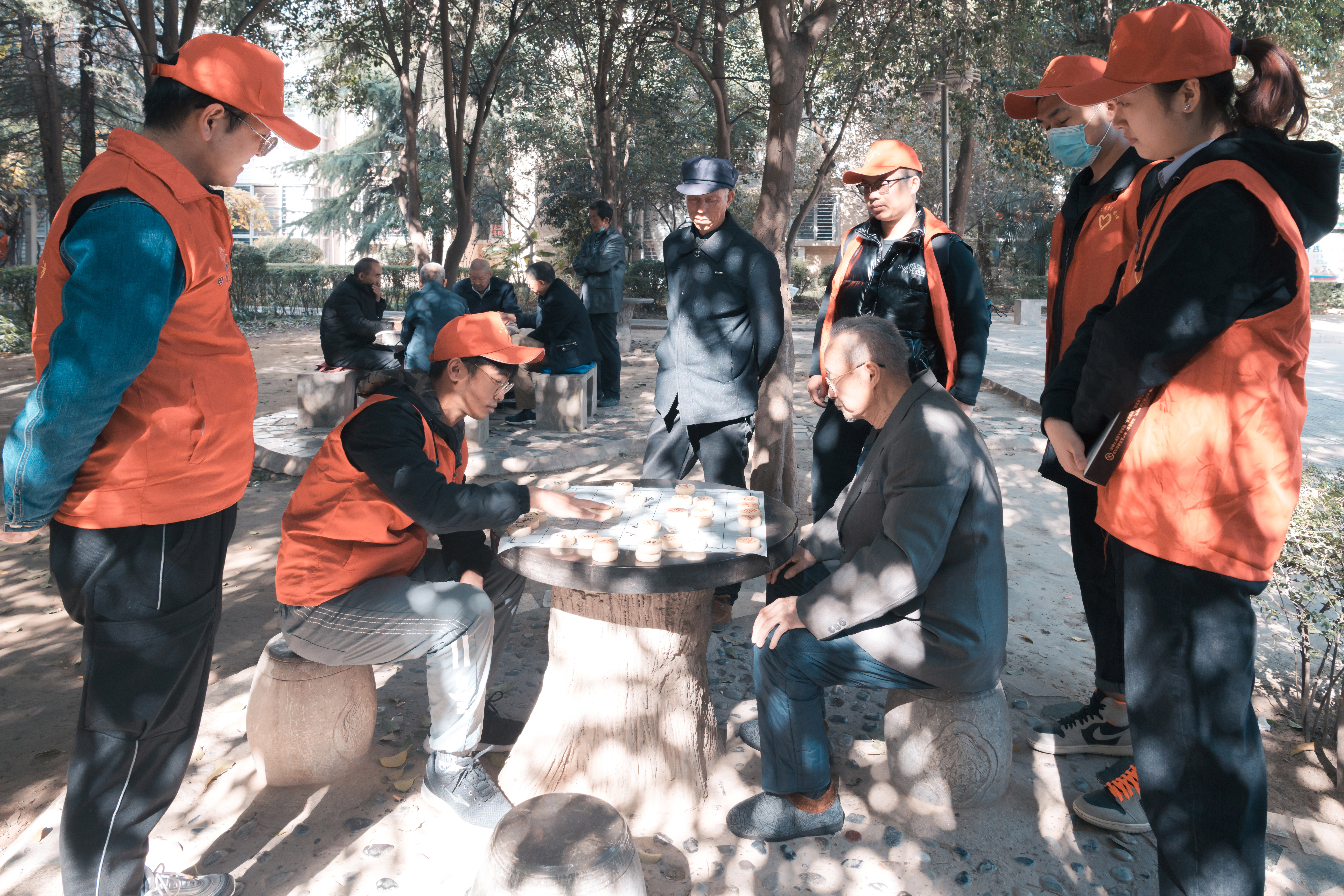 午飯過后,志愿者們帶著老人們來到了社區(qū)的中心廣場。他們有的陪老人散步、閑話家常;有的陪老人擺開棋陣、對陣博弈;有的捶肩搓手、噓寒問暖;有的大秀才藝,給老人們解悶……志愿者的到來令老人們心情愉悅,他們也紛紛敞開心扉,分享起歡樂的往事,歡聲笑語不時回蕩在在冬日的暖陽下。