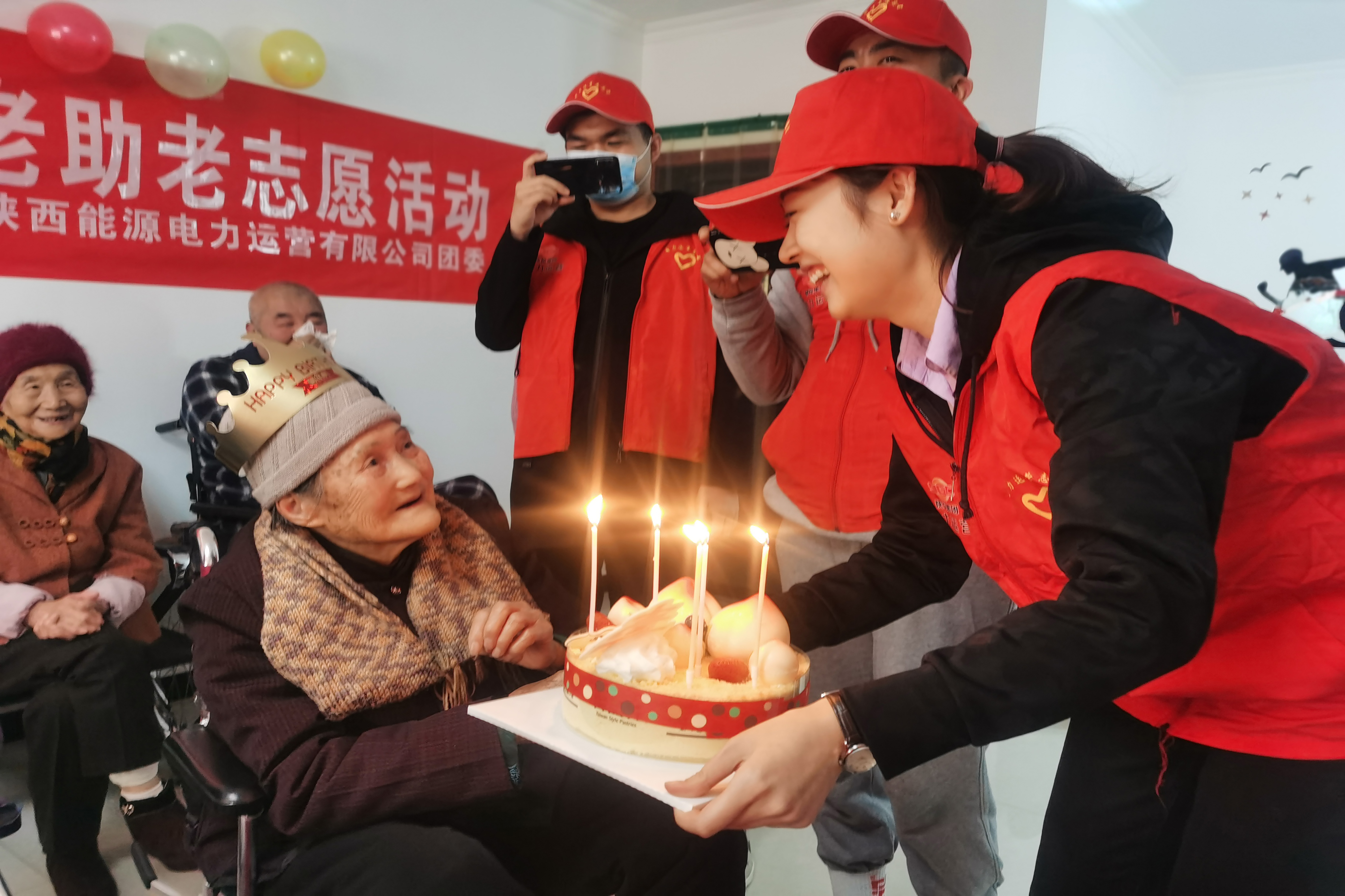 志愿者還為兩位過生日的老壽星精心設(shè)計了生日會,通過唱生日歌、才藝展示及游戲互動等環(huán)節(jié)送上生日祝福。兩位老壽星在光影閃爍的蛋糕前許下心愿,伴著聲聲祝福享受著美好時光。