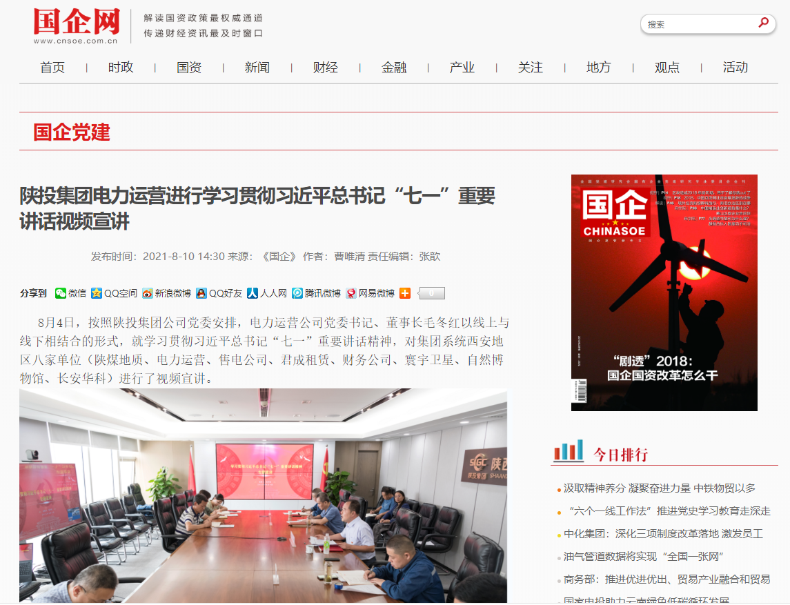 8月4日,按照陜投集團(tuán)公司黨委安排,電力運營公司黨委書記、董事長毛冬紅以線上與線下相結(jié)合的形式,就學(xué)習(xí)貫徹習(xí)近平總書記“七一”重要講話精神,對集團(tuán)系統(tǒng)西安地區(qū)八家單位(陜煤地質(zhì)、電力運營、售電公司、君成租賃、財務(wù)公司、寰宇衛(wèi)星、自然博物館、長安華科)進(jìn)行了視頻宣講。