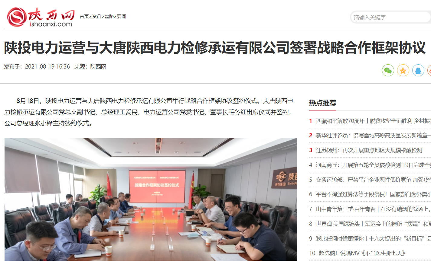 8月18日,公司與大唐陜西電力檢修承運有限公司舉行戰(zhàn)略合作框架協(xié)議簽約儀式。大唐陜西電力檢修承運有限公司黨總支副書記、總經(jīng)理王愛民,電力運營公司黨委書記、董事長毛冬紅出席儀式并簽約,公司總經(jīng)理張小鋒主持簽約儀式。