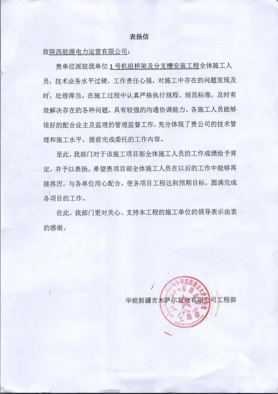 日前,公司分別收到渭河發(fā)電、吉木薩爾發(fā)電的感謝信、表?yè)P(yáng)信。