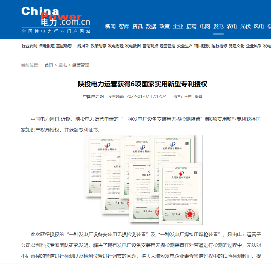 近期,陜投電力運(yùn)營申請(qǐng)的“一種發(fā)電廠設(shè)備安裝用無損檢測(cè)裝置”等6項(xiàng)實(shí)用新型專利獲得國家知識(shí)產(chǎn)權(quán)局授權(quán),并獲頒專利證書。