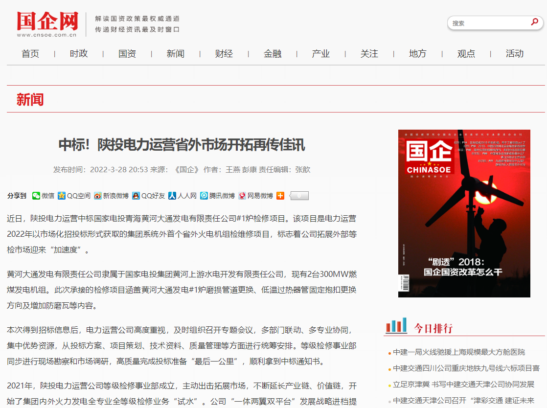 近日,陜西能源電力運(yùn)營有限公司中標(biāo)國家電投青海黃河大通發(fā)電有限責(zé)任公司#1爐檢修項(xiàng)目。該項(xiàng)目是電力運(yùn)營2022年以市場化招投標(biāo)形式獲取的集團(tuán)系統(tǒng)外首個(gè)省外火電機(jī)組檢維修項(xiàng)目,標(biāo)志著公司拓展外部等檢市場迎來“加速度”。