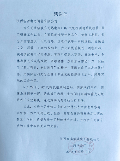 近日,金泰氯堿熱電分廠發(fā)來感謝信,對(duì)公司按期、安全、圓滿完成#2汽輪機(jī)調(diào)速系統(tǒng)檢修、閥門研磨檢修項(xiàng)目表示感謝。