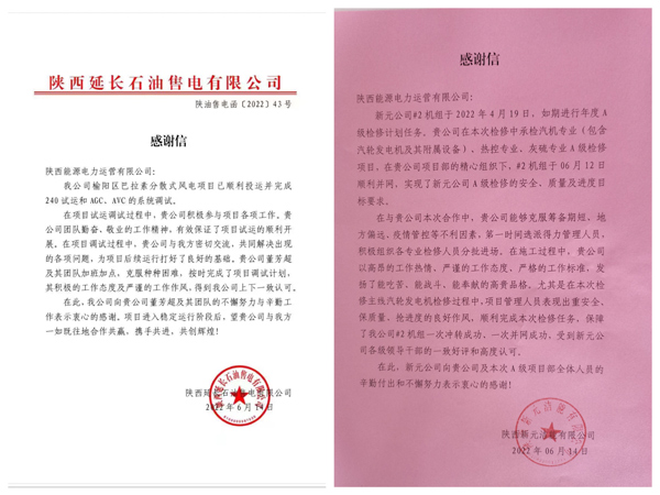 6月14日,陜煤新元潔能、延長售電先后發(fā)來感謝信,對公司優(yōu)質(zhì)完成#2機(jī)組A級檢修、巴拉素分散式風(fēng)電機(jī)組240試運和 AGC、AVC 的系統(tǒng)調(diào)試項目表示感謝。