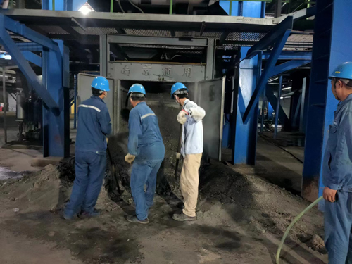 白天除了要完成檢修準(zhǔn)備工作,還要清理堆積如山的積渣積灰。因煤質(zhì)原因,每隔2小時就要用3米多長的管子伸進爐膛打焦。爐膛的高溫不一會兒就會將管子前端燒得通紅。時值三伏時節(jié),現(xiàn)場悶熱難耐、粉塵飛揚,汗水混著粉塵在臉上流淌。積渣積灰清掃工作是對檢修人員體力和耐力的嚴(yán)峻考驗。#1鋼帶距離地面只有50多公分高,只能蜷縮身體鉆進去,螞蟻搬家似的一點點掏出積渣積灰。大家心往一處想、勁往一處使,只想著讓干渣機盡早正常運轉(zhuǎn)。