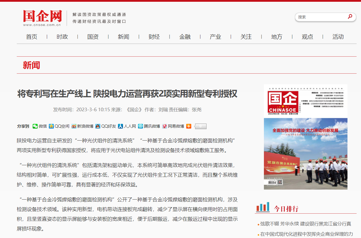 電力運(yùn)營(yíng)自主研發(fā)的“一種光伏組件的清洗系統(tǒng)”“一種基于合金冷弧焊熔敷的磨面檢測(cè)機(jī)構(gòu)”兩項(xiàng)實(shí)用新型專利獲得國家授權(quán),將應(yīng)用于光伏電站組件清洗及檢測(cè)設(shè)備技術(shù)領(lǐng)域熔敷施工服務(wù)。
