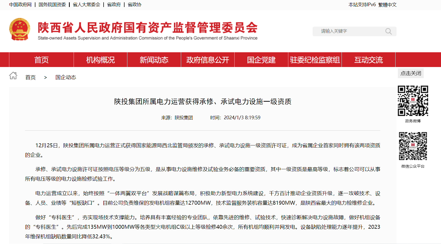 12月25日,陜投集團所屬電力運營正式獲得國家能源局西北監(jiān)管局頒發(fā)的承修、承試電力設施一級資質許可證,成為省屬企業(yè)首家同時擁有該兩項資質的企業(yè)。