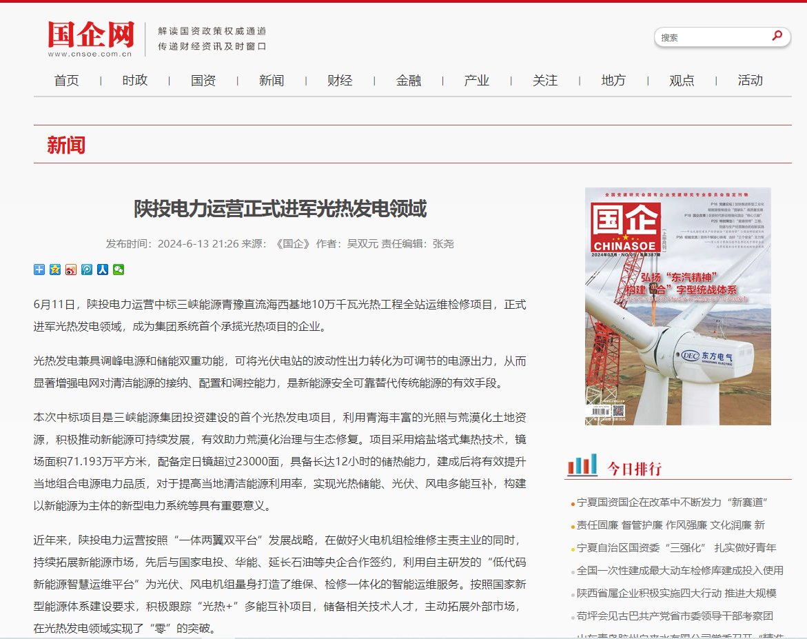 6月11日,電力運營中標三峽能源青豫直流海西基地10萬千瓦光熱工程全站運維檢修項目,正式進軍光熱發(fā)電領(lǐng)域,也是陜投集團首個承攬光熱項目業(yè)務(wù)的企業(yè)。