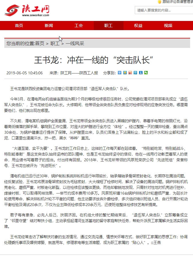 今年3月,在渭電兩臺機組接連面臨為期3個月的等級檢修艱巨任務時,公司黨委在渭河項目部率先成立“退伍軍人突擊隊”,王書龍被任命為隊長。大修期間,他帶領全體突擊隊員負責應對檢修現場的應急突發(fā)任務。哪里需要他們,他們就出現在哪里。