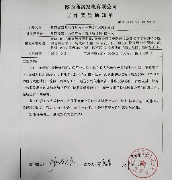 11月6日,商洛項目部收到商洛發(fā)電工作獎勵5000元,以表彰儀電隊在近期加班加點完成#1機組159臺電機,#2機組10kV2段母線修檢和預試等工作。這是今年以來,項目部繼鍋爐班順利完工脫硫系統(tǒng)改造管道,獎勵5000元;汽化水班如期完成#1機組主汽閥、調閥解體,獎勵3000元;鍋爐班副班長李海峰發(fā)現(xiàn)#2爐螺旋水冷壁泄露重大缺陷,獎勵個人2000元后,收到的第四筆業(yè)主方工作獎勵。