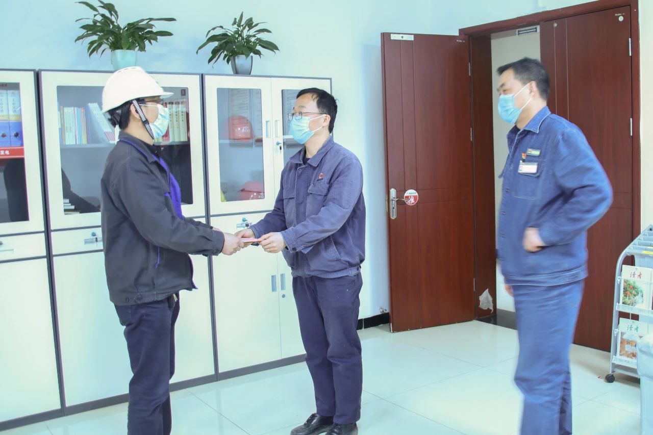4月21日,商洛項(xiàng)目部領(lǐng)導(dǎo)前往商洛發(fā)電設(shè)備部,親手將2900元愛心捐款交到田超同志手中。