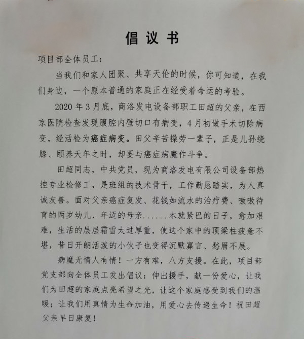 近日,商洛發(fā)電設(shè)備部職工田超的父親因患癌癥入院治療。聞知消息后,立即向全體職工發(fā)出捐款倡議,大家伸出援助之手,紛紛慷慨解囊,積極踴躍捐款,以實(shí)際行動(dòng)表達(dá)電力運(yùn)營(yíng)對(duì)兄弟單位員工的關(guān)愛。