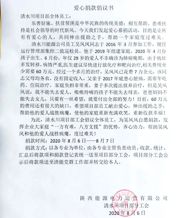 近日,在得知清水川能源職工吳風(fēng)風(fēng)愛(ài)人不幸身染重病,目前在醫(yī)院治療,費(fèi)用仍有很大缺口的消息后,清水川項(xiàng)目部分工會(huì)立即向全體職工發(fā)出倡議,號(hào)召大家發(fā)揚(yáng)互助、關(guān)愛(ài)的精神,伸出手來(lái)幫助吳風(fēng)風(fēng)和家人戰(zhàn)勝病魔,渡過(guò)難關(guān)!