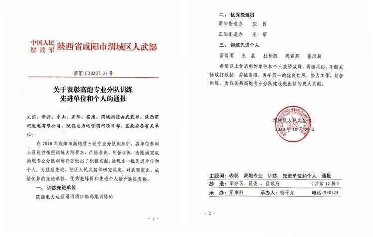 10月25日,在結(jié)訓(xùn)總結(jié)表彰大會(huì)上,國(guó)防動(dòng)員單位領(lǐng)導(dǎo)對(duì)渭河項(xiàng)目部參訓(xùn)人員的表現(xiàn)給予充分肯定,對(duì)他們雷厲風(fēng)行的作風(fēng)和頑強(qiáng)拼搏的精神給予高度贊揚(yáng)?!瓣兡茈娏\(yùn)營(yíng)渭河項(xiàng)目部高炮訓(xùn)練班”被咸陽(yáng)市渭城區(qū)人民武裝部評(píng)為“年度訓(xùn)練先進(jìn)單位”,張彤新同志被評(píng)為“年度訓(xùn)練先進(jìn)個(gè)人”,并予以通報(bào)表彰,為公司贏得了榮譽(yù)。